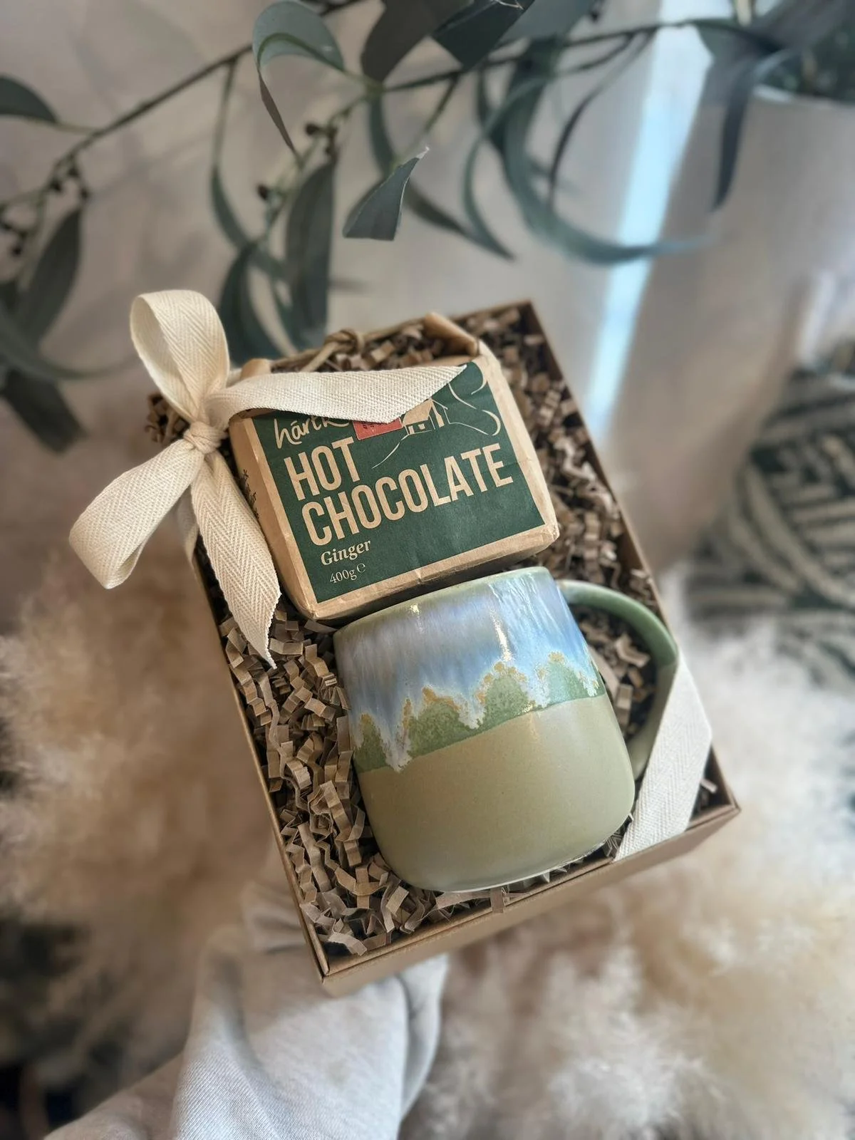 Warm, cozy, and beautifully crafted — this gift box is the perfect treat for anyone who loves a comforting moment to themselves. Inside, you’ll find a premium Ginger Hot Chocolate mix paired with a handcrafted ceramic mug, nestled in eco-friendly shredded paper and finished with an elegant ribbon.