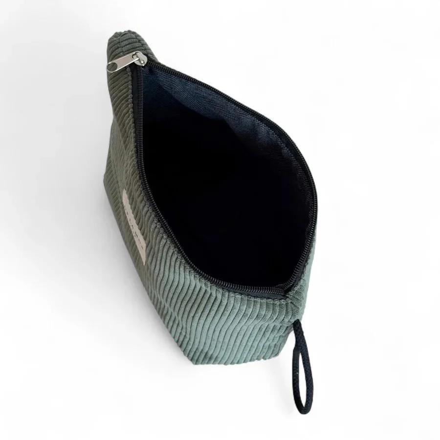 Large makeup bag with a top zipper and a black cord handle on the side. Made with thick green corduroy fabric. Each item may have a variation in the print, depending on where the piece was cut. For proper care, we recommend washing in cold water and not using a dryer.