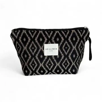 Makeup bag with a top zipper and a beige cord handle on the side. Made with a geometric print fabric in orange tones. Lined with thick gray fabric on the inside. For proper maintenance, it is recommended to wash it by hand and in cold water and not to use a dryer.