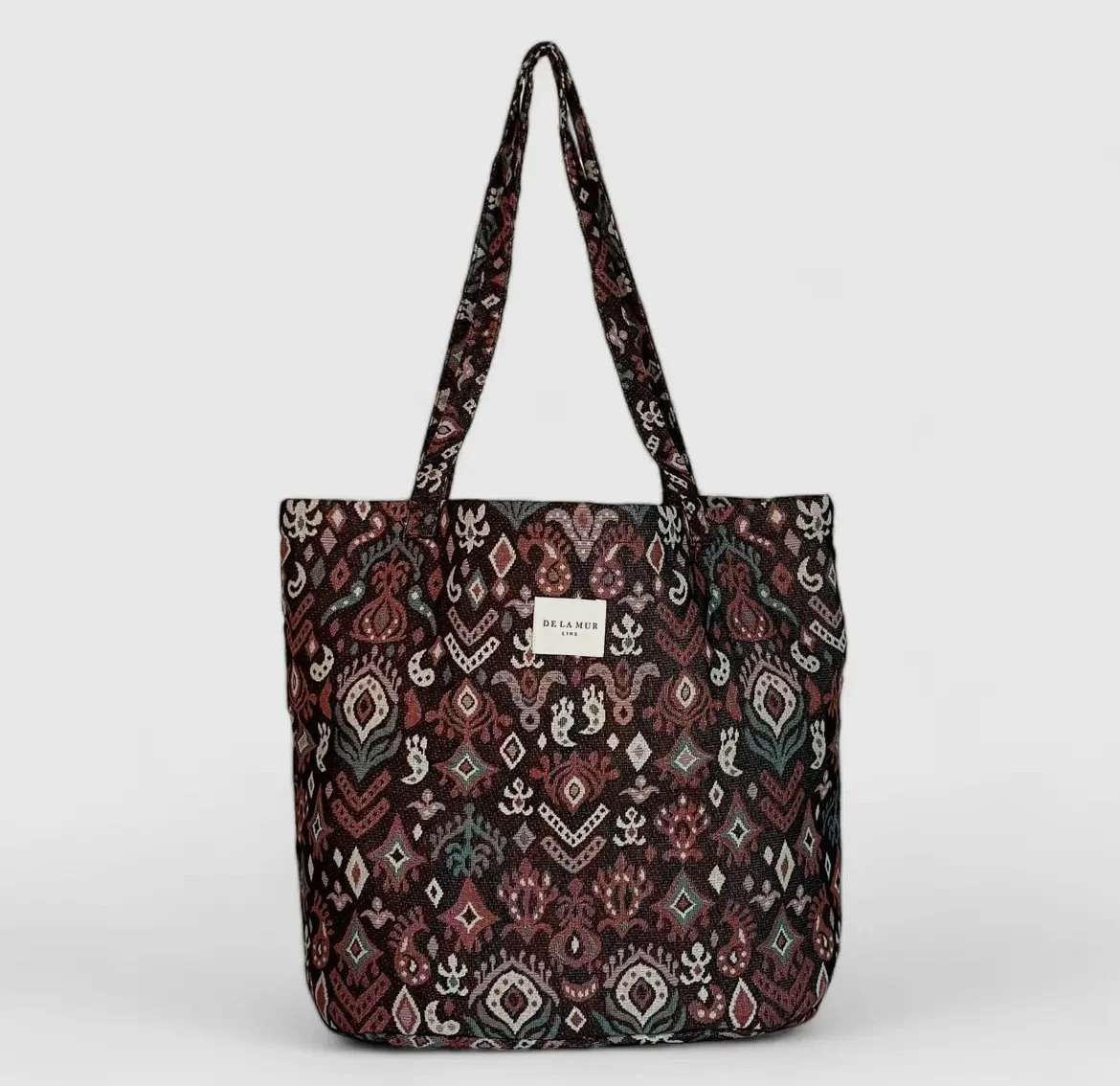 Large shopper bag with handles to carry over the shoulder. Made with a thick jacquard fabric with a geometric print in maroon tones. For proper maintenance, it is advisable to wash it cold by hand and not to use a dryer.