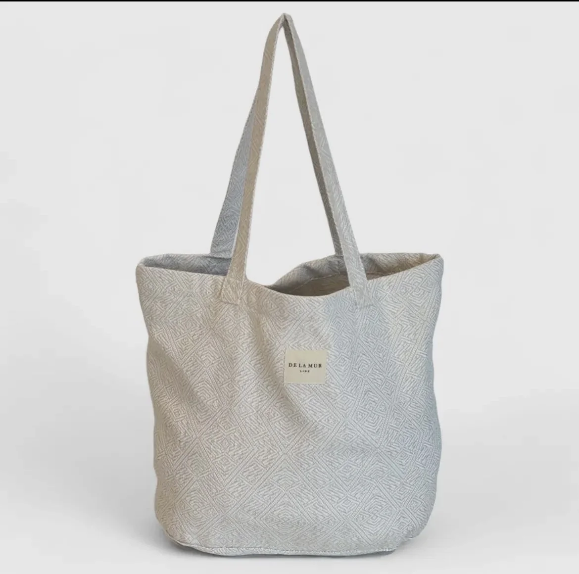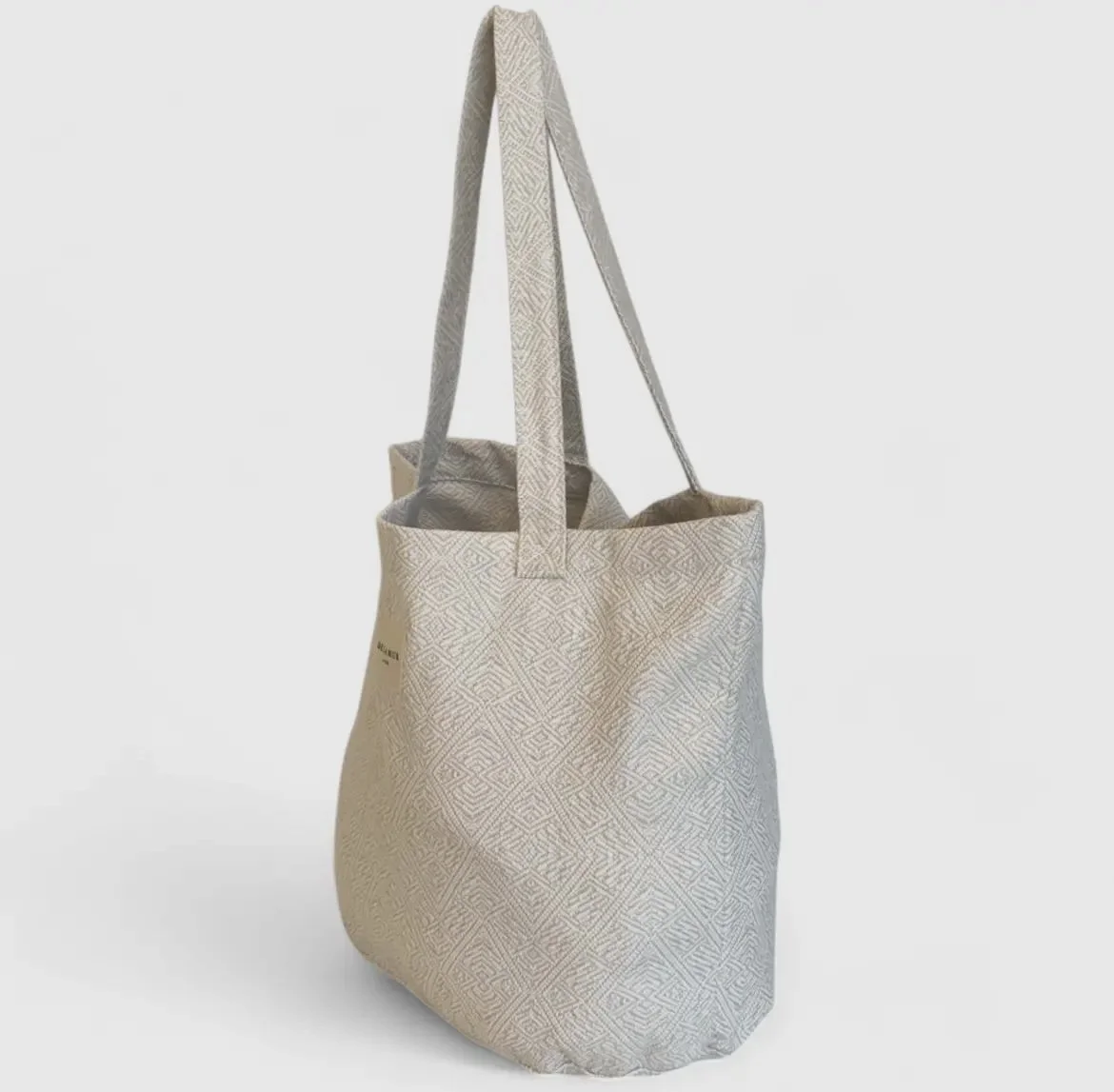 Large shopper bag with handles to carry over the shoulder. Made of thick jacquard fabric with a raw coloured geometric print . For proper maintenance, it is advisable to wash it cold by hand and not to use a dryer.