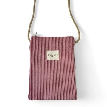 Crossbody-style phone bag with a zipper at the top and a long beige cotton drawstring. Made with thick pink corduroy fabric. Each item may have a variation in the print, depending on where the piece was cut. Lined with thick gray fabric on the inside. For proper care, we recommend hand washing in cold water and not using a dryer.