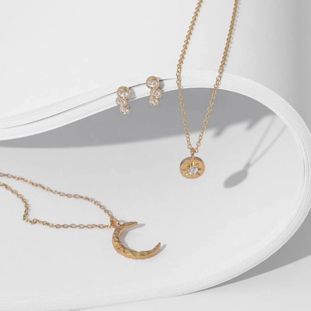 This eye-catching textured moon necklace brings a touch of celestial charm to your look. Featuring an adjustable 16-18" chain, it offers versatile wear—perfect on its own or layered with your preferred necklaces.