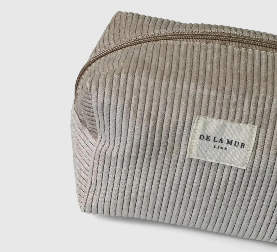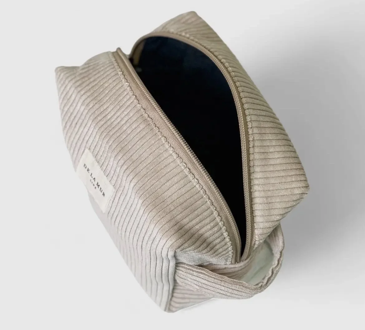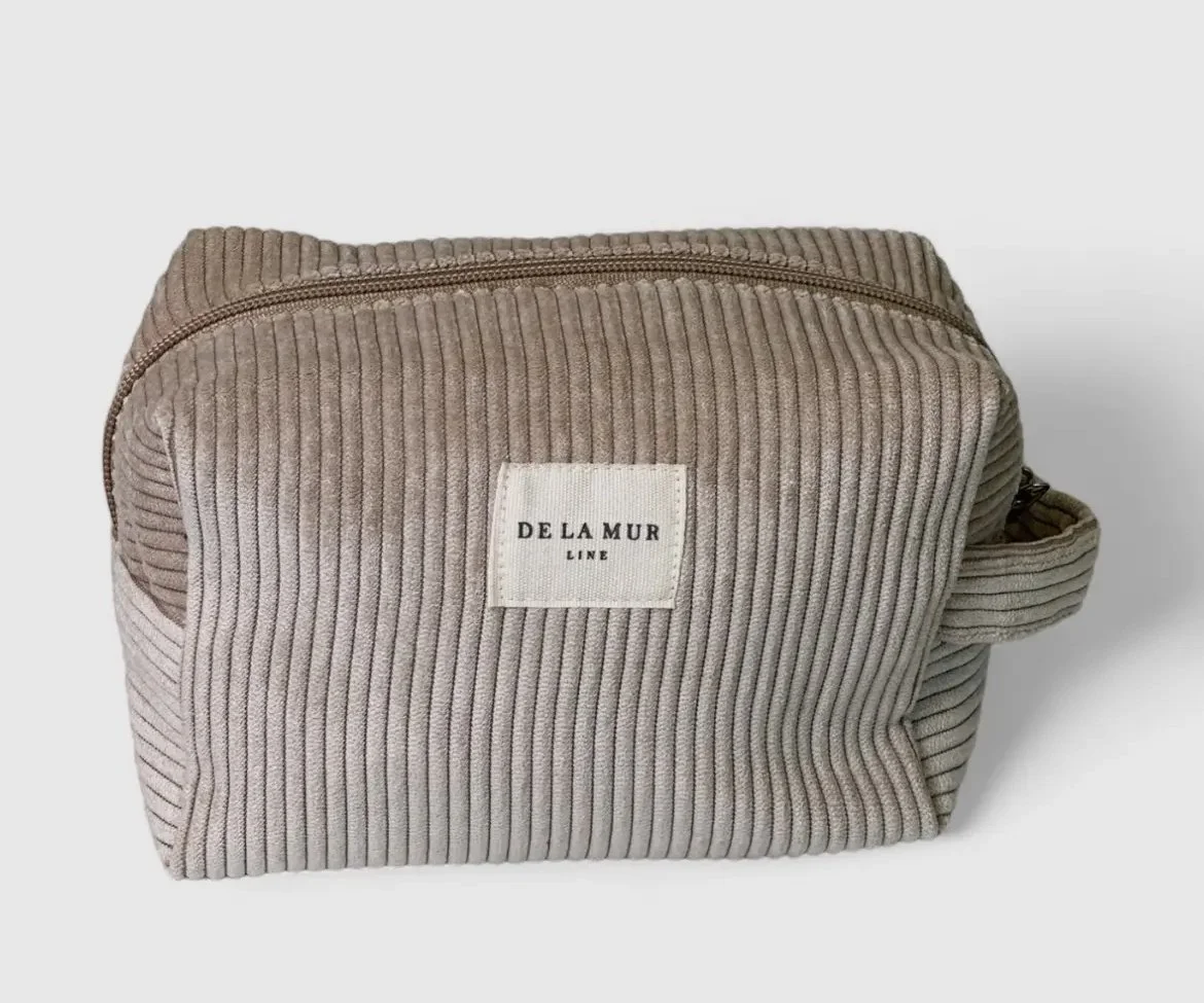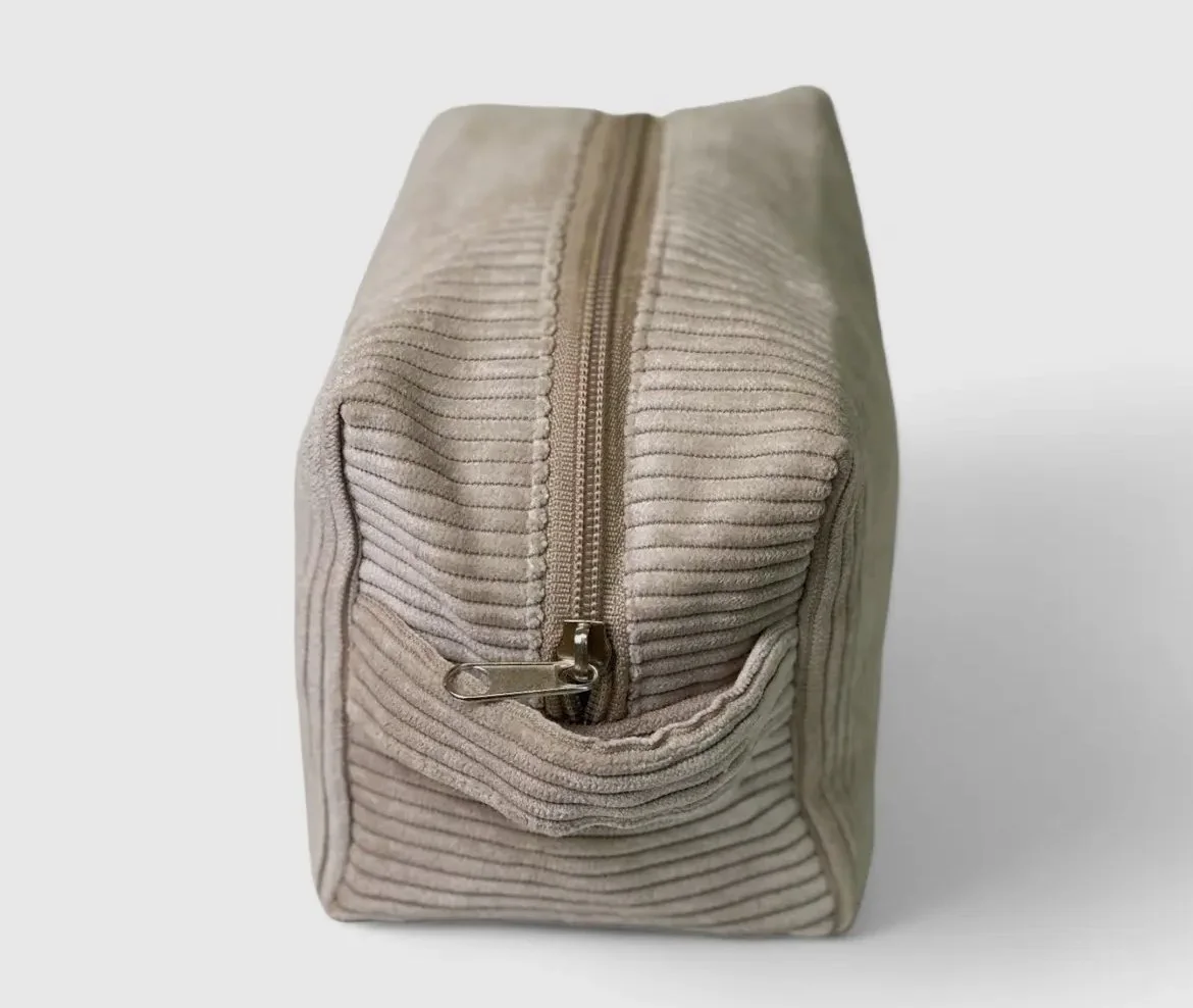 Small toiletry bag with a top zipper and a side handle. Made with thick Beige corduroy fabric. It is recommended to wash it in cold water and not use a dryer.