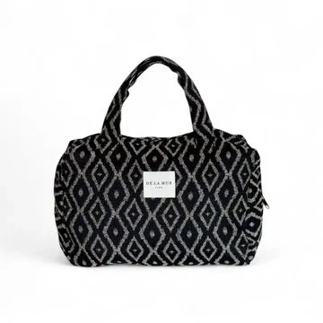 Large toiletry bag with a zippered top and fabric handles. Made with thick jacquard fabric with a multicoloured geometric print. Lined with thick gray fabric on the inside. For proper care, we recommend hand washing in cold water and not using a dryer.