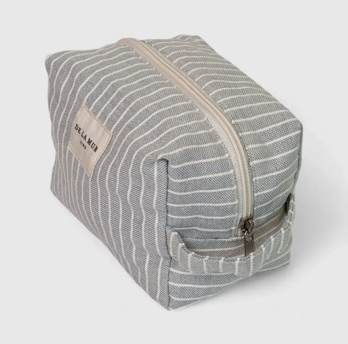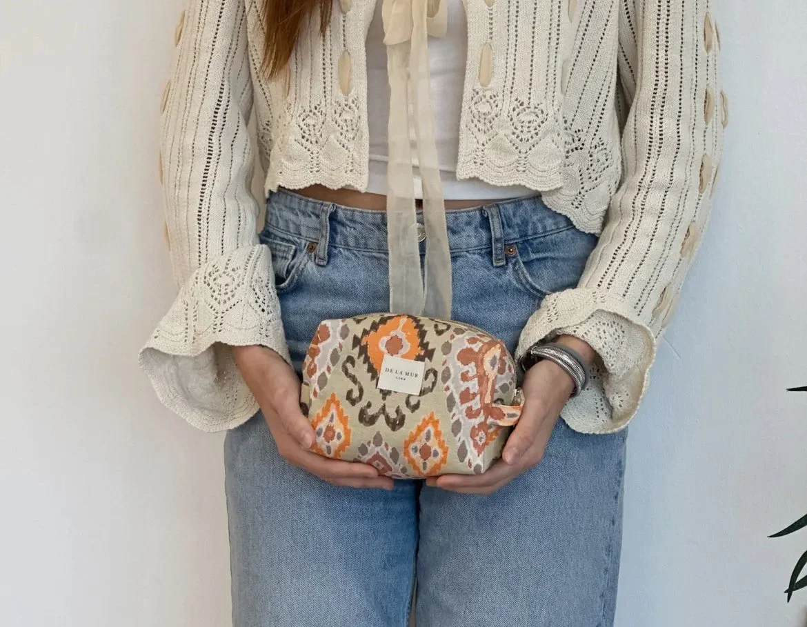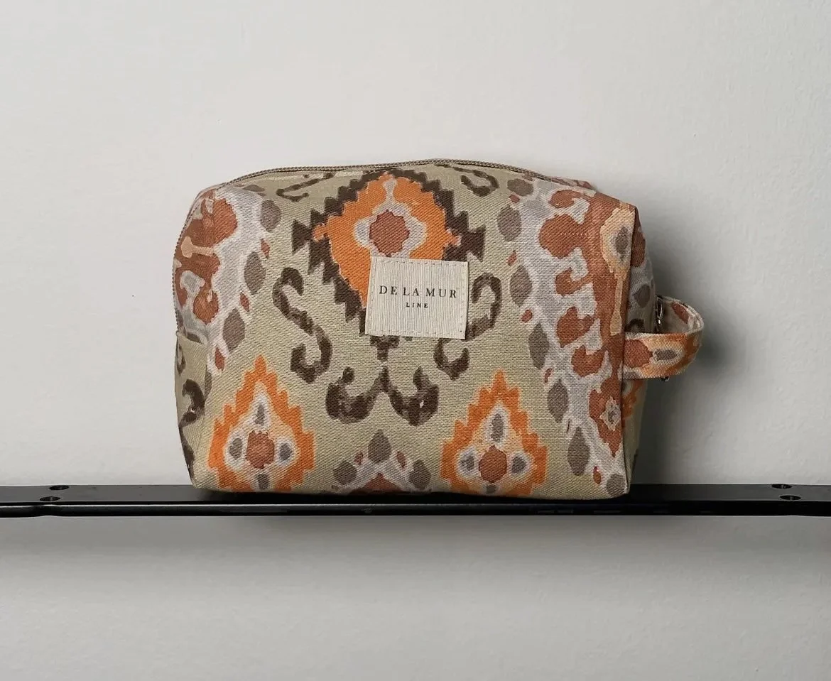 Small bag with zip on the top and with side handle. With a green fabric with toile de jouy print. For proper maintenance, it is advisable to wash it in the cold and not to use a dryer.