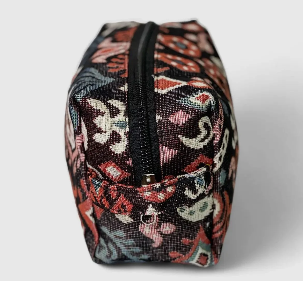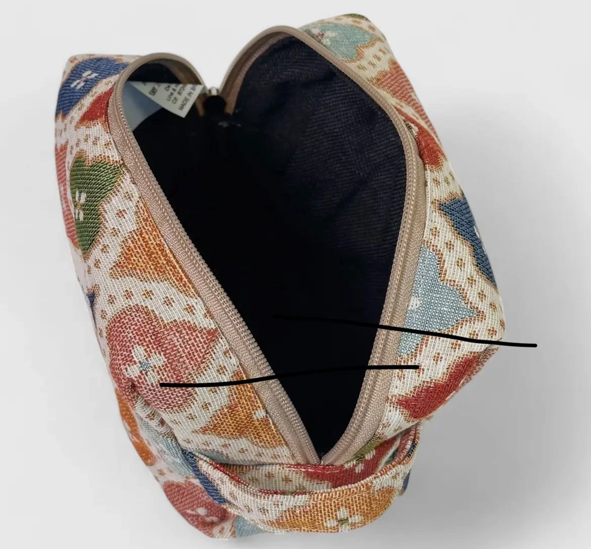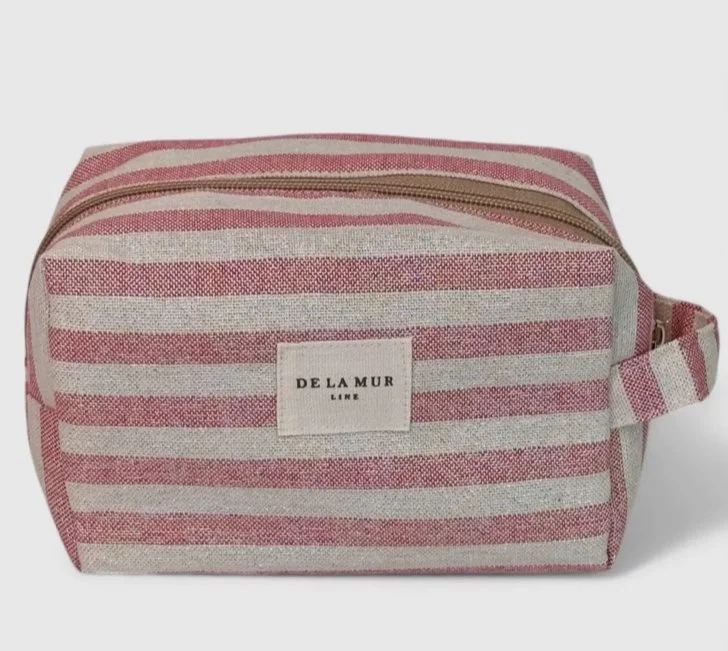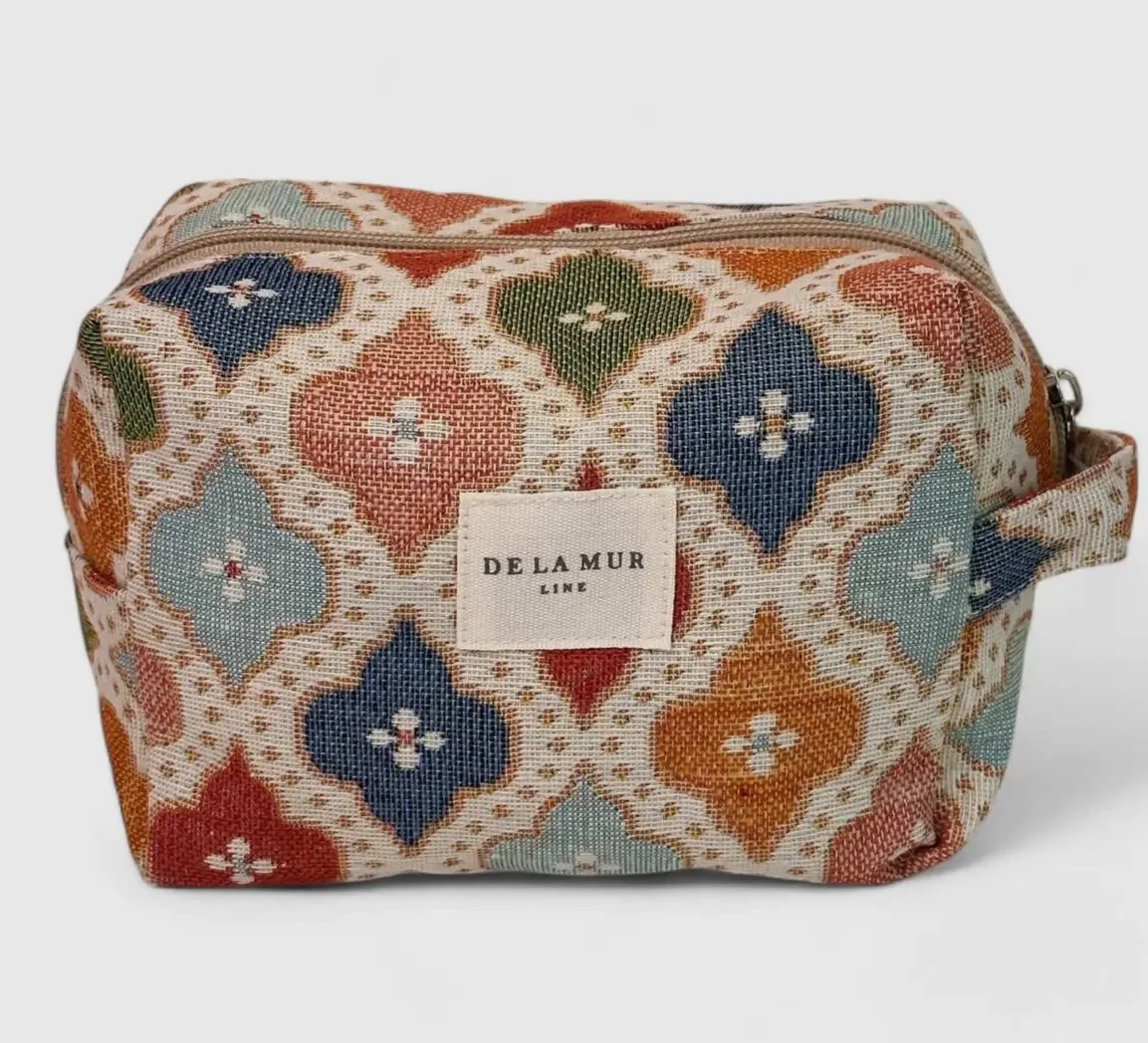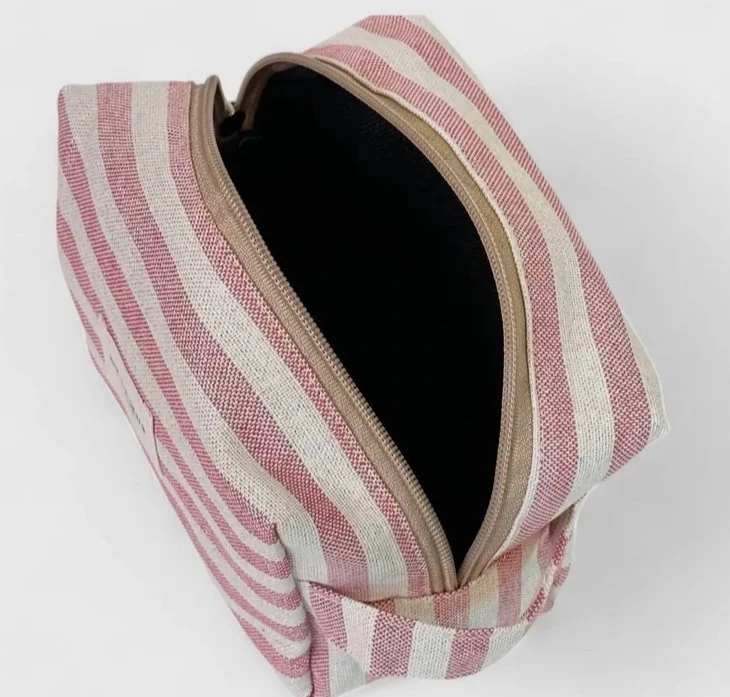 Small bag with zip on the top and with side handle. With a fabric with a geometric print with horizontal and multicolored stripes. For proper maintenance, it is advisable to wash it in the cold and not to use a dryer.
